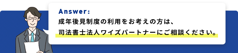 また、人によっては成年後見制度の利用が正解とも限らないため、そうした判断も含めて司法書士法人ワイズパートナーにご相談ください。